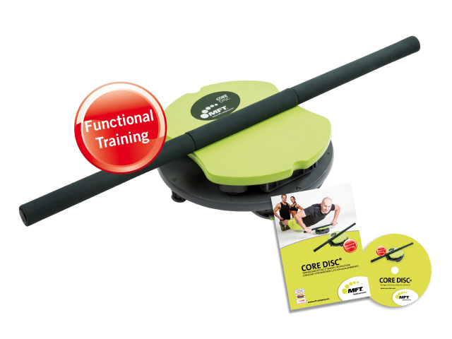 Jeder kennt sie: die klassische Liegestütze. Und das aus gutem Grund, denn trotz ständig neuer Trainingsphilosophien und immer ausgefallener Trainingsgeräte ist sie nach wie vor eine äußerst effektive Übung, um den Schultergürtel zu stärken. Mit der MFT Core Disc bekommt die klassische Liegestütze einen ganz neuen Anspruch – doch das grüne Trainingsgerät bietet noch deutlich mehr. Das Design der Disc ermöglicht es, Kipp-, Dreh- und Rotationsbewegungen durchzuführen, während man sich an der 750 mm breiten Stange abstützt. Durch diese einstellbare Instabilität muss zusätzliche Haltearbeit verrichtet werden, wodurch auch tieferliegende Muskelgruppen angesprochen werden. So soll auchdie Rumpfstabilität erhöht werden.
